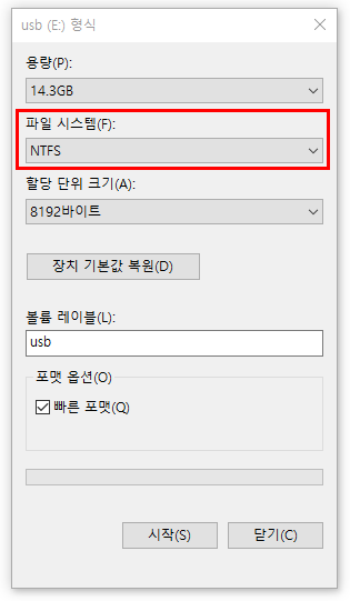 - 기본 할당 크기 : USB를 다양한 용도로 사용할 경우 기본으로 설정합니다.