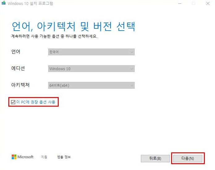 '이 PC에 권장 옵션 사용'에 체크하고 다음 버튼을 누릅니다.