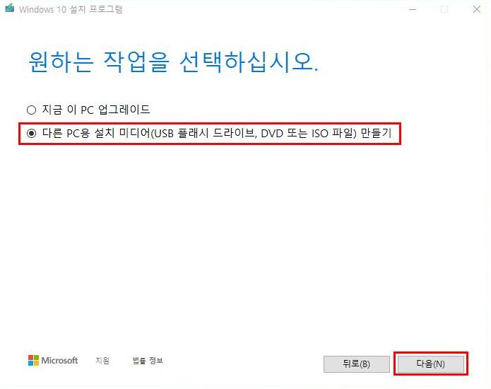 두 번째 '다른 PC용 설치 미디어'를 선택하고 다음 버튼을 누릅니다.
