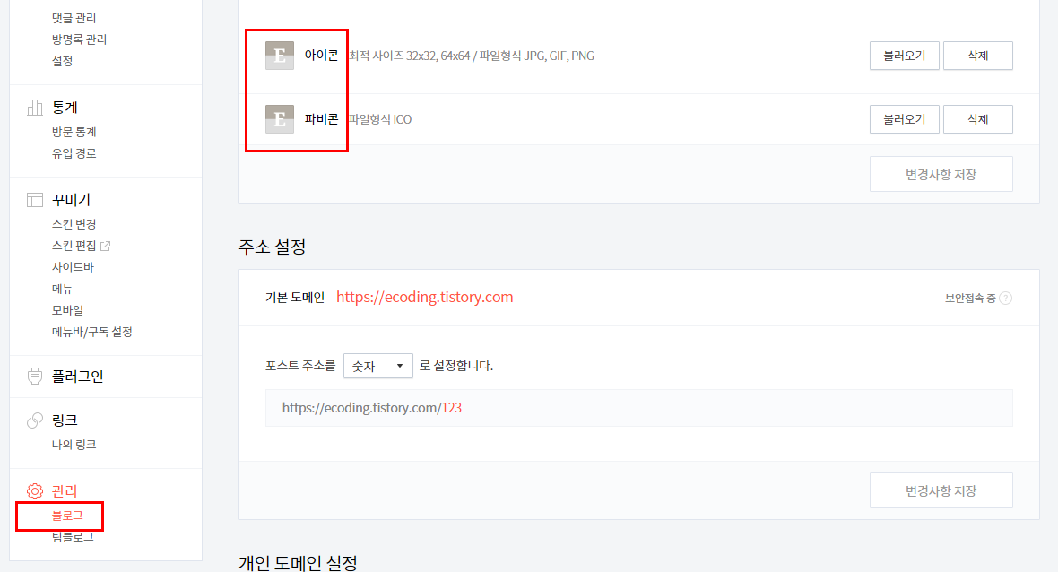 관리 모드에서 '관리' > '블로그'를 누르면 아래와 같이 나타난다. 사이즈를 미리 32*32, 64*64로 만들어놓고 불러오기로 저장하면 끝이다.